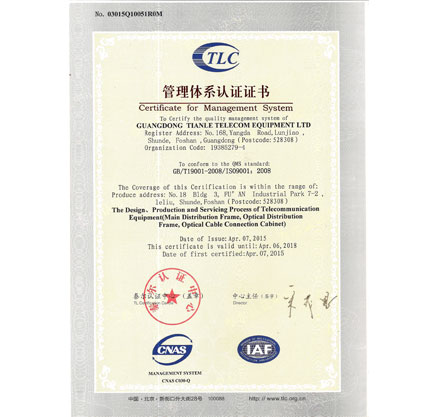 Guangdong Tianle Telecommunication Equipment Limited Company was formerly named Guangdong NO.1 Telecom-equipment Manufactory......Certification